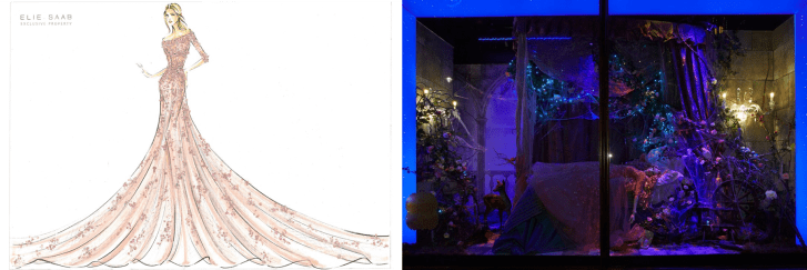 The second Disney High Fashion event of the month! This coincides with the article I posted in a daily Roundup of the Disney princesses Harrods window display! If you didn’t see it the links are here to articles from Vogue, Fashion Foie Gras, Daily Telegraph & Daily Mail, with full coverage of the opening of the displays, that included a live Cinderella in her carriage as well as the process of the designs (including sketches from all of the articles). Here are some of my favorites (the princesses included are Cinderella, Snow White, Rapunzel, Tiana, Ariel, Pocahontas, Jasmine, Belle, Aurora, Mulan):
