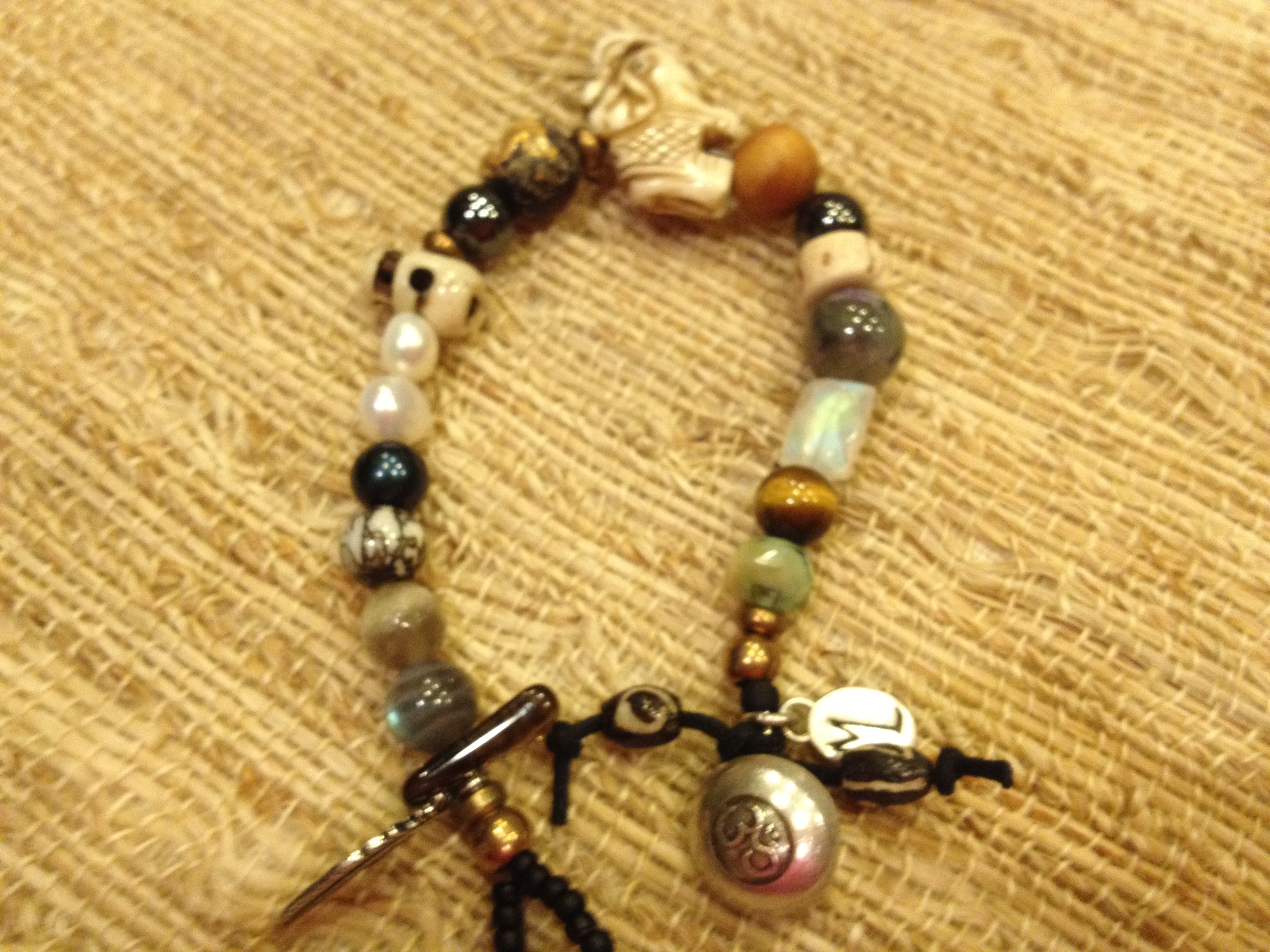 What did I make it with (from left to right) : feather, smokey quartz, labradorite, moonstone, Om Mani Beads, 3 pearls, skulls, hematite, Buddha bead from Tibet, Elephant, SandalWood, Hematite, Bone Bead, Charoite, Moonstone, Tiger’s Eye and Czech glass with an Om closure.