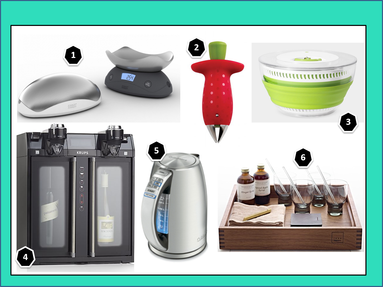 1. Shell™ Compact digital scales 2.The Stem Gem 3.Collapsible Salad Spinner 4. Krups® Wine Dispenser 5. Cuisinart® PerfecTemp™ Cordless Electric Kettle
