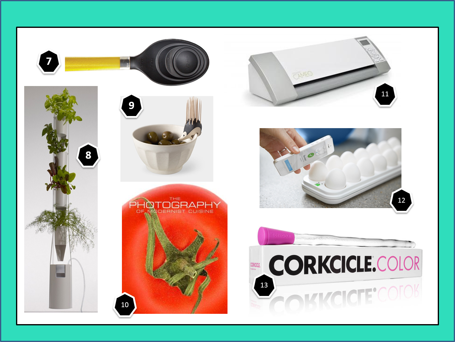 6. Cocktail Set Seasonal Collection 7. Portion Classic Measuring Spoon 8. Windowfarms 9. Kipik Toothpick Holder 10. The Photography of Modernist Cuisine 11. Silhouette CAMEO® electronic cutting machine 12. Egg Minder smart egg tray 13. Corkcicle Color wine chiller