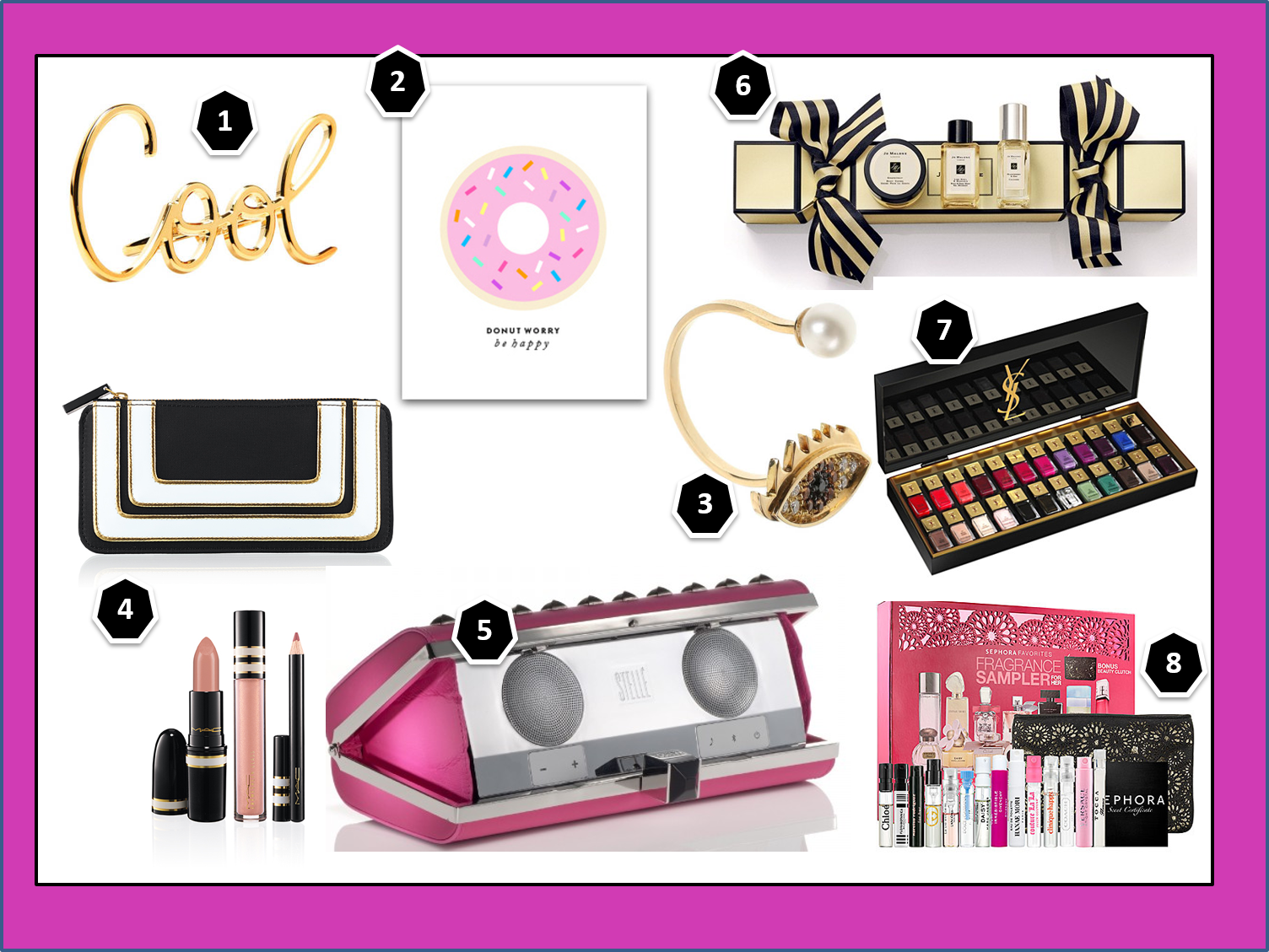1. Lanvin Cool ring 2.SS print Shop by Glitter guide Donut Worry Be Happy Print 3. Delfina Delettrez Cartoon Eye and Pearl Ring 4. MAC Stroke of midnight Kit 5. Rebecca Minkoff Stelle audio clutch 6. Jo Malone Christmas Craker 7. YVES SAINT LAURENT La Laque Couture Colour Collection 8. Sephora Fragance Sampler