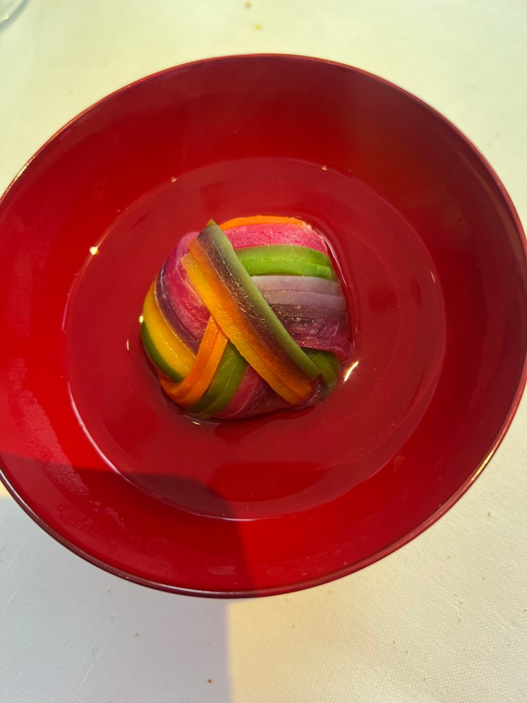 Temari (Karuma Shrimp) – this dish had a whole page of explanation (As can be seen above) and its a perfect paly of beauty and delicious food. All the “strings” were actually vegetables in their real colors no dyes. And inside a delicious shrimp ball. Also this kimoto sake is the best sake I have ever had